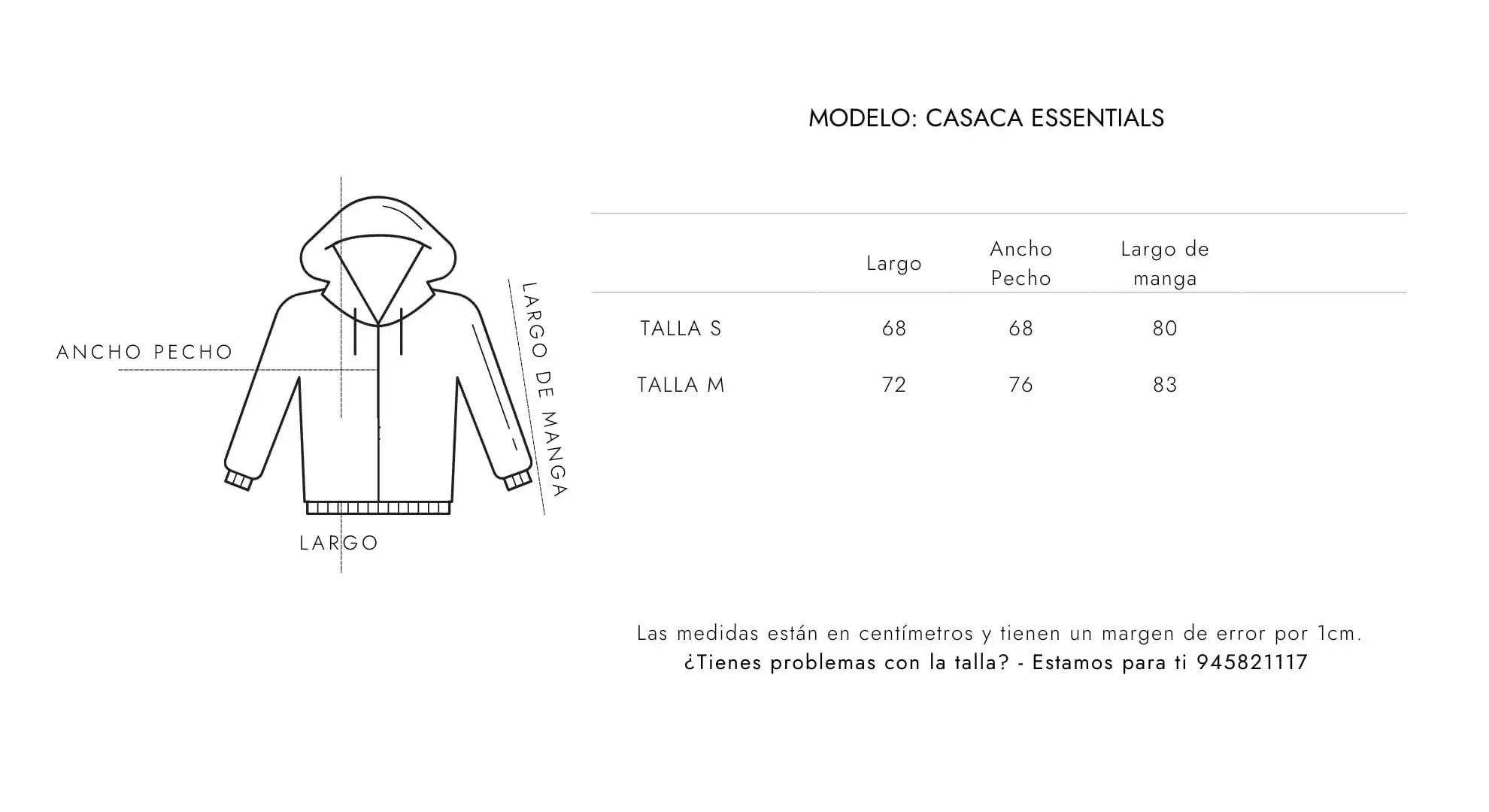 La Casaca Essentials es un modelo Oversize, tiene dos detalles Sublimados, diseño de ESSENTIALS en el pecho y en la parte trasera
